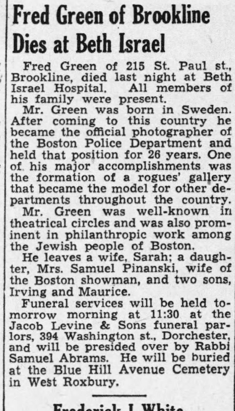 He married Sarah Libby Cohen, a New York native, in 1890 and worked as a photographer. Family recollections add further, though sometimes imprecise, details. At one point I believed that Fred Green had been involved in lobbying the Commonwealth of Massachusetts to require photographs on driver’s licenses, but I now think this was a mistaken inference, likely arising from his long association with police identification photography.