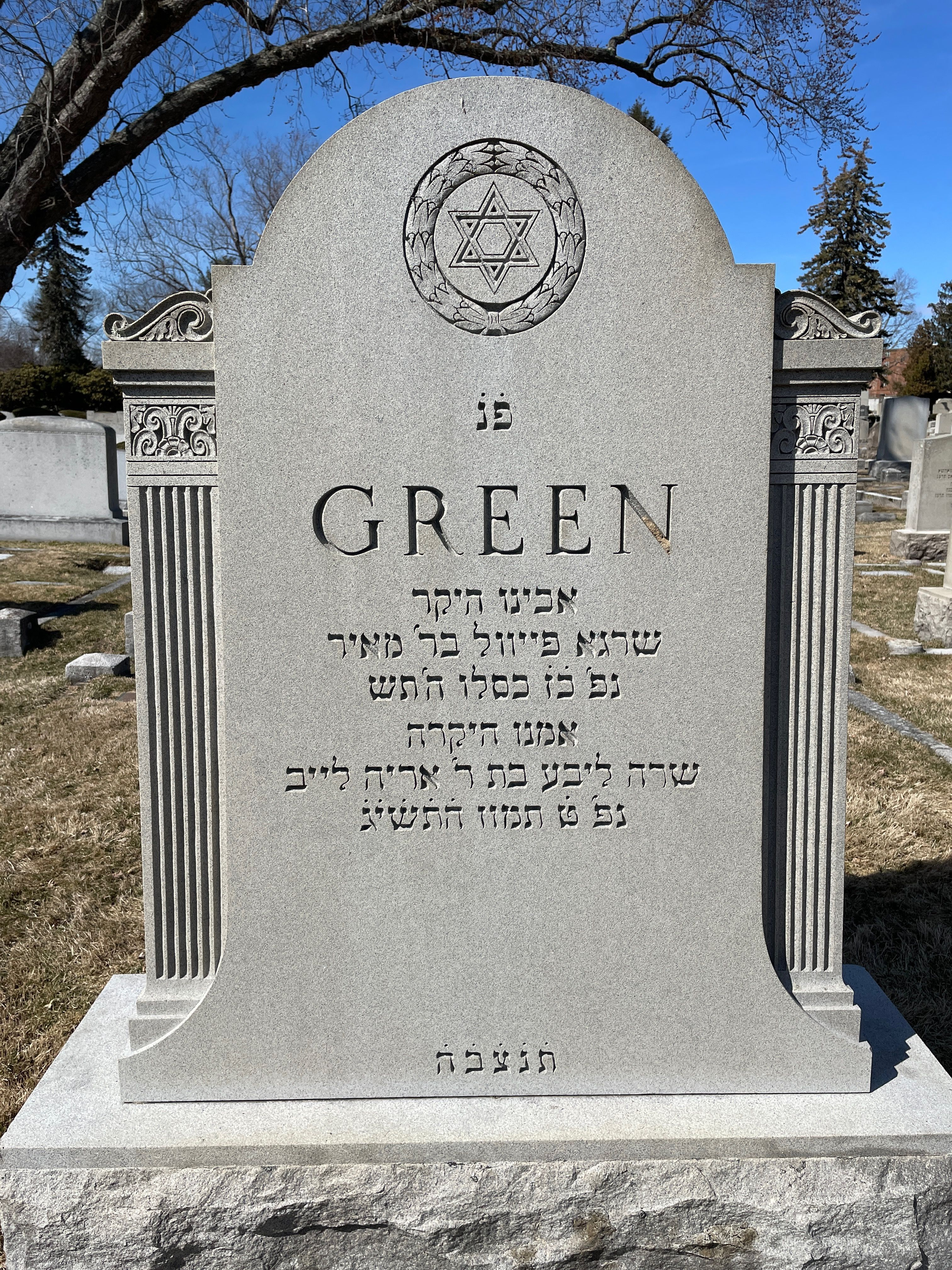 It was there, in Sweden, that their son Fredrick Philip (Fred) Greenberg was born in August 1865. His exact birthdate is not consistent across sources. In sworn testimony given during his naturalization process, Fred stated that he was born on 17 August 1865, while his tombstone records his birthdate as 10 August 1865. His Hebrew name, Shraga Feivel, is preserved on the tombstone.