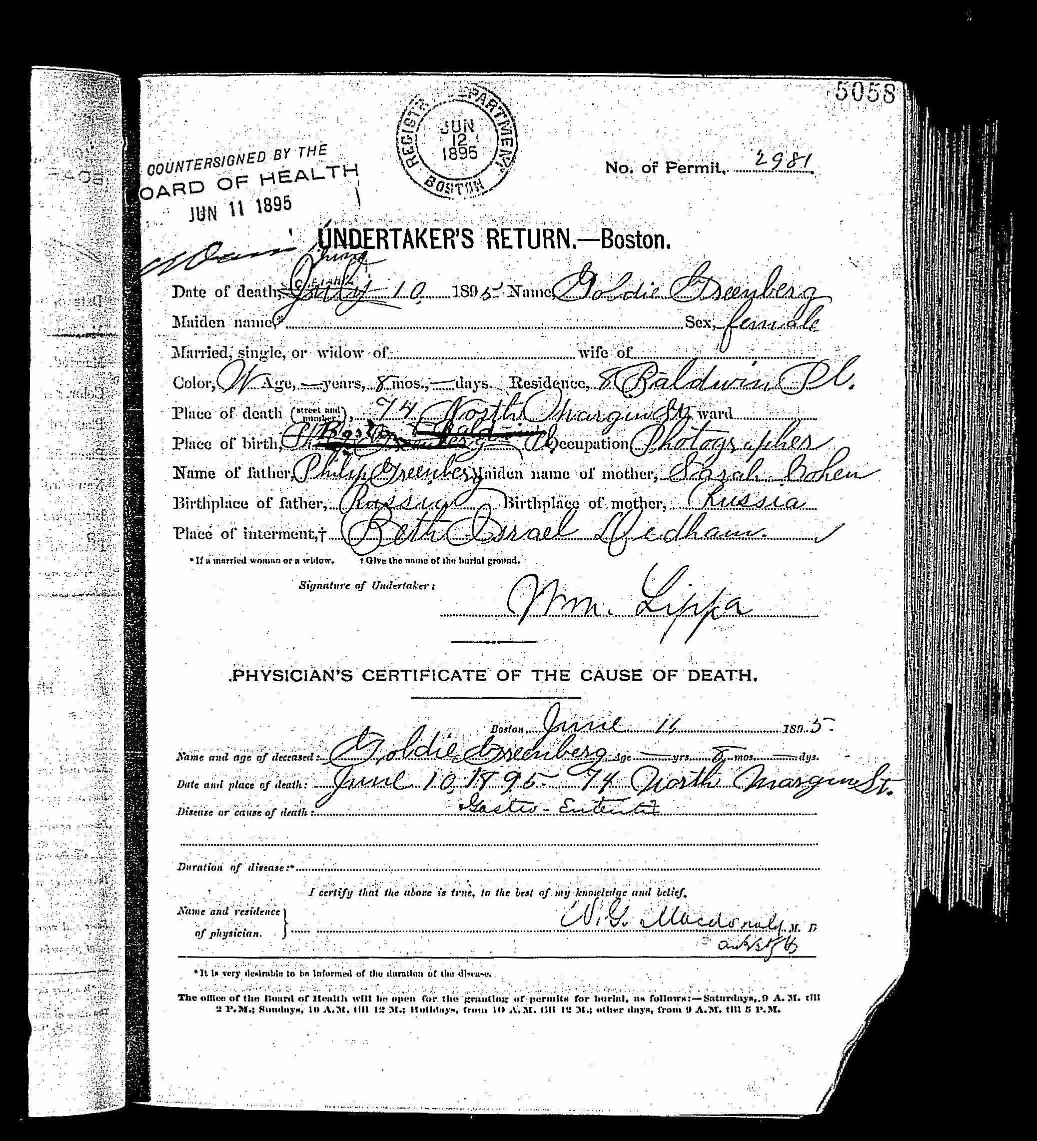 It is noteworthy that Boston civil records are inconsistent in their recording of the parents’ origins. In one record, Fred and Sarah are listed as having come from Poland, while a death certificate records their origins as Russia. Neither designation aligns with other documentation, which shows that Fred was born in Sweden and Sarah was American-born. These discrepancies likely reflect the broad and imprecise manner in which Jewish origins were recorded in late nineteenth-century Boston, rather than the actual biographical facts of the family.