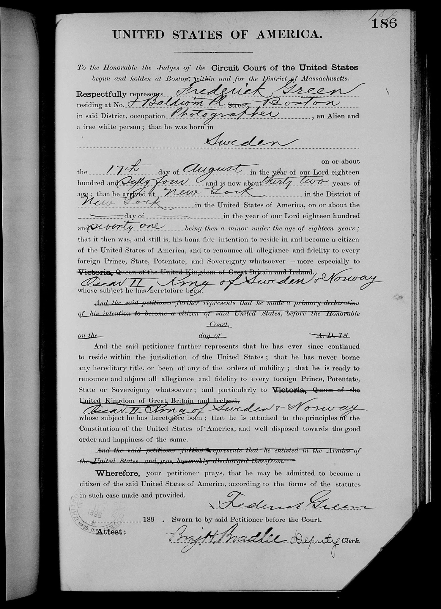 In 1871, Fred emigrated to the United States with his family, a date likewise supported by his sworn naturalization testimony. Depending on the exact date of arrival (only the year of arrival is recorded), he would have been five or six years old at the time. According to family memory, he retained the ability to speak Swedish later in life. His surname was shortened to Green at some point before his Naturalization Testimony, taken in September of 1895.